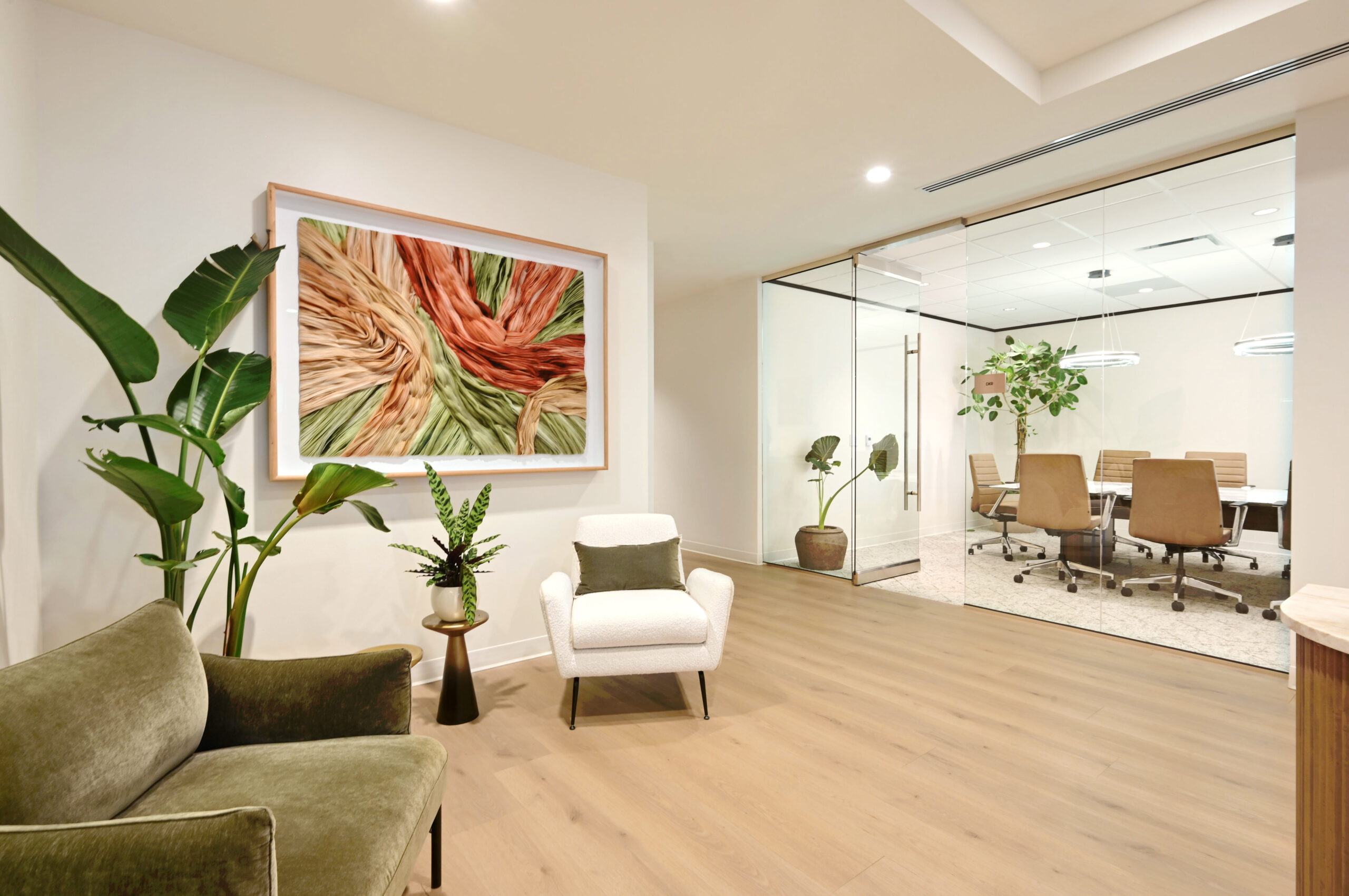 Rich wood tones, a stone feature wall and brass accents establish a cohesive material palette, while creamy neutrals keep the space approachable and timeless. The result is a modern workplace designed to enhance the experience of both clients and employees.